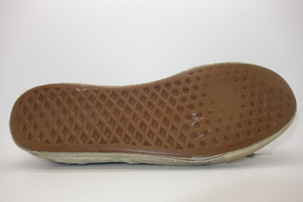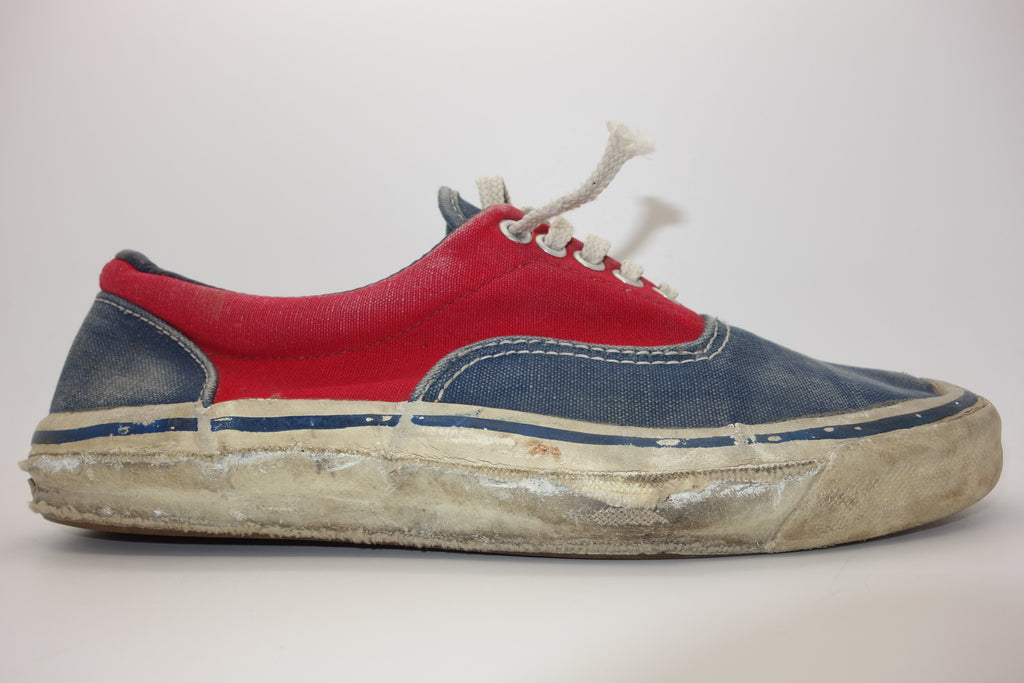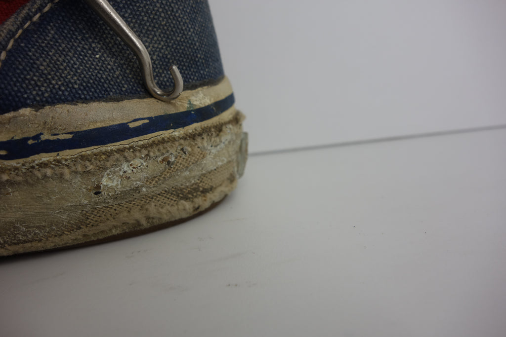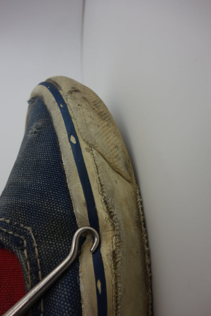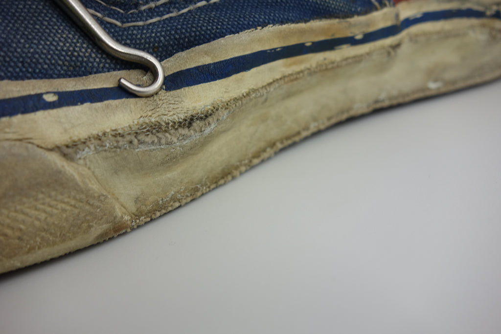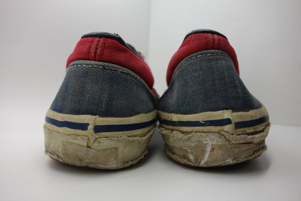good used condition. well-loved yes but rubber remains soft & flexible (but for small areas at heels) despite being somewhat dry & crusty. structurally however they are sound with no wear to insole or internal heel counter. the start of 1 small hole at left big toe, but denim-like uppers will maintain. from experience these will hold up to normal wear. laces not original. size not visible but confident of US7.5 if not US8.