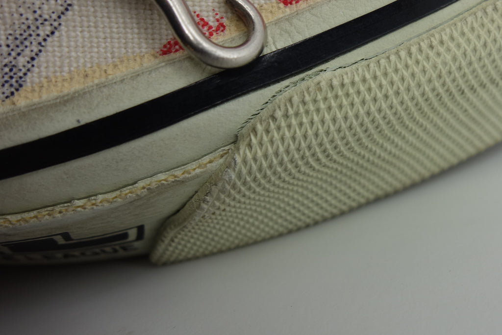 superb used condition. left shoe saw short term use as floor model display with resulting rubber yellowing. rubber remains soft & flexible albeit dry. minimal stress cracking to base of first foxing & minor jigsaw cracking at left heel. womens US10 fit narrow & suit best women or men with narrow-normal feet.