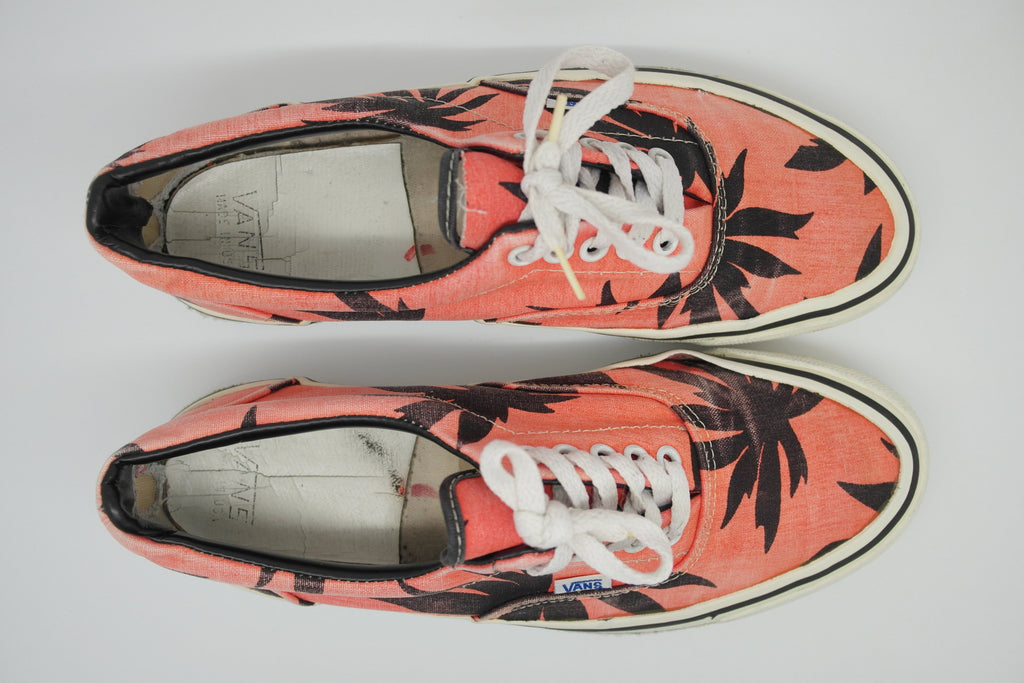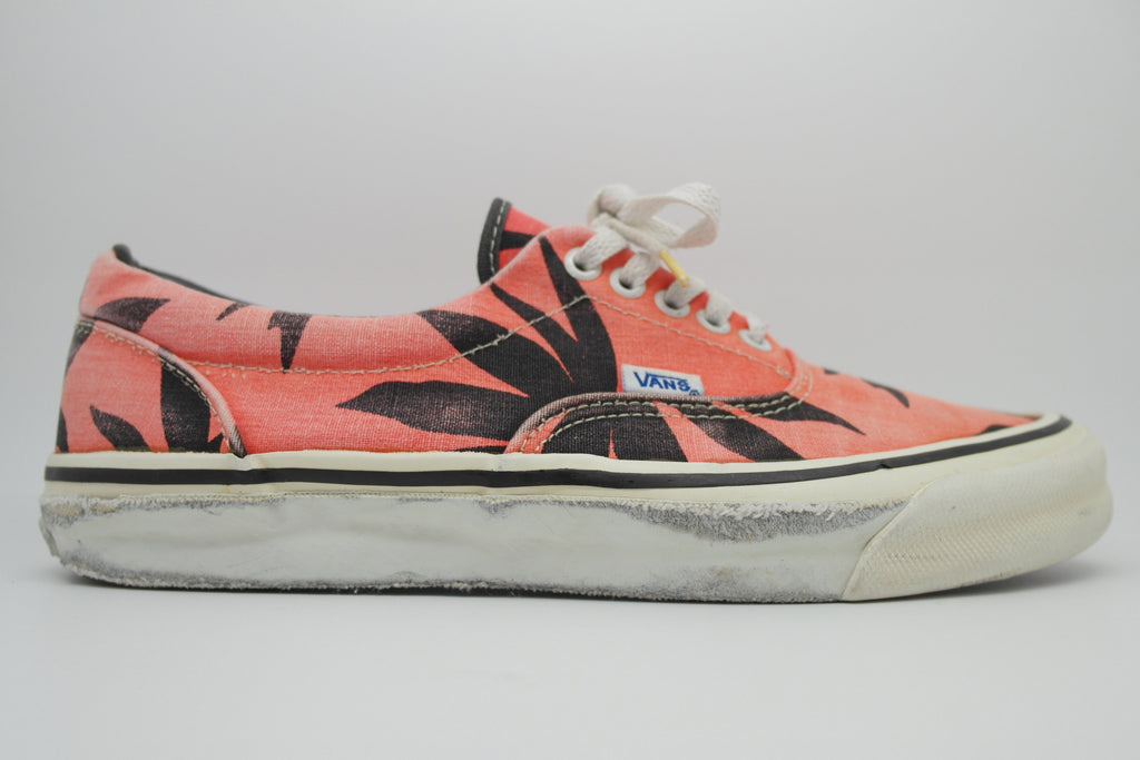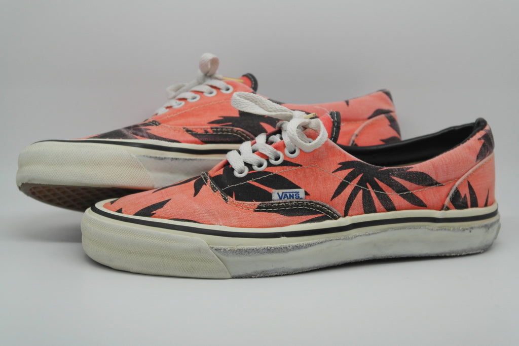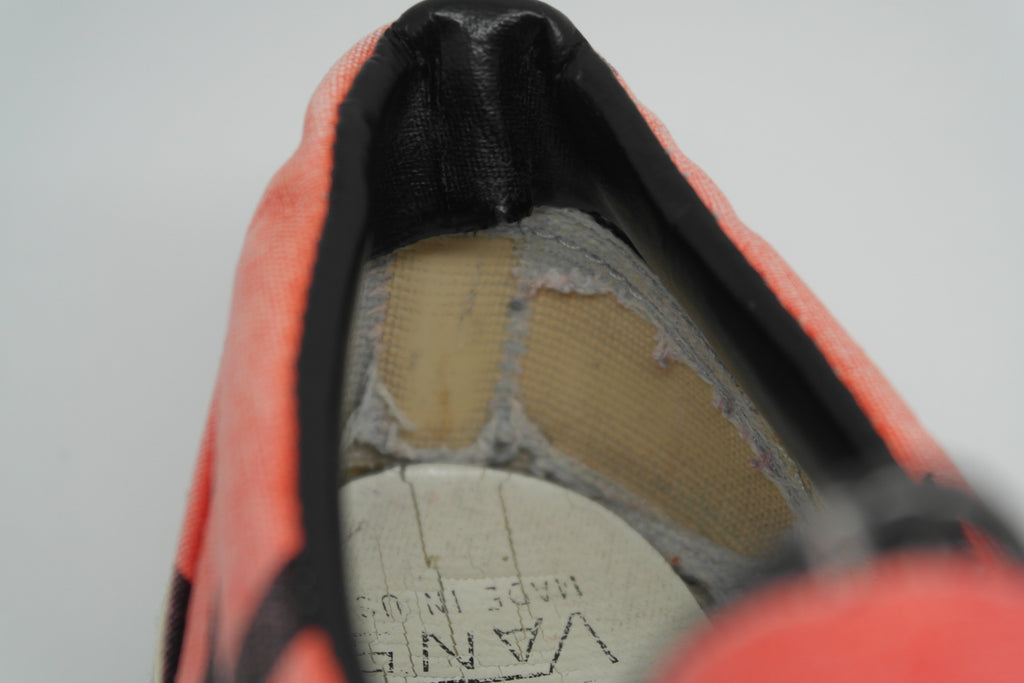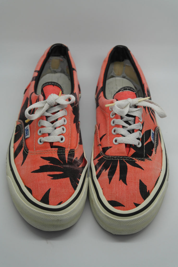 very good used condition. most liekly machine washed but rubber remains soft & flexi. some separation between midsole & uppers at toe creases. minimla stress cracking between bumper & first foxing. piping has separated from left tongue. wear to lining of internal heel cap but no cracking or breakdown. split to vinyl collar of left heel exposing foam. footbed & inner lining unaffected however some minimal wear to internal toe cap through to canvas. colour is bright orange & more vivid than photos suggest. box is of correct era & print but is incorrect size & colourway