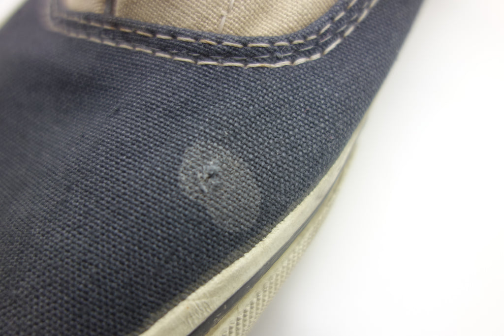 very good used condition. rubber is near flawless superficially however the top of the first foxing has cured & WILL CRACK! only the area of white rubber above the black foxing stripe is affected however i forsee this cracking & chipping away, perhaps gouging into the stripe area & below. the friction, bumper & waffle itself are unaffected. both shoes list US9.5 however possibly the right shoe fits slightly bigger. check measures & wear at own risk!