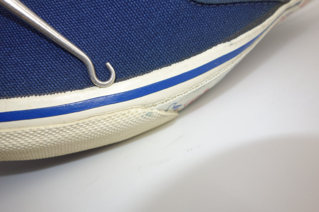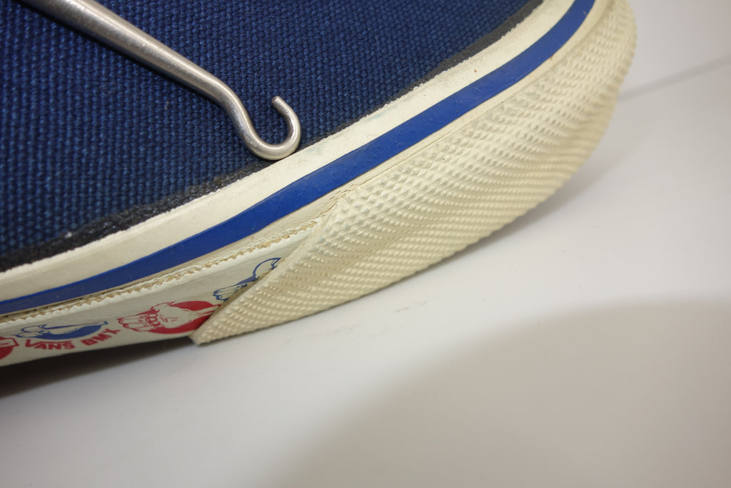 the left shoe saw very very short term use as display floor model with resulting minor yellowing to rubber at toe & minimal micro stress cracking from crush injury. all rubber remains soft supple & flexible & from experience pairs of this age hold up to any discolouration.