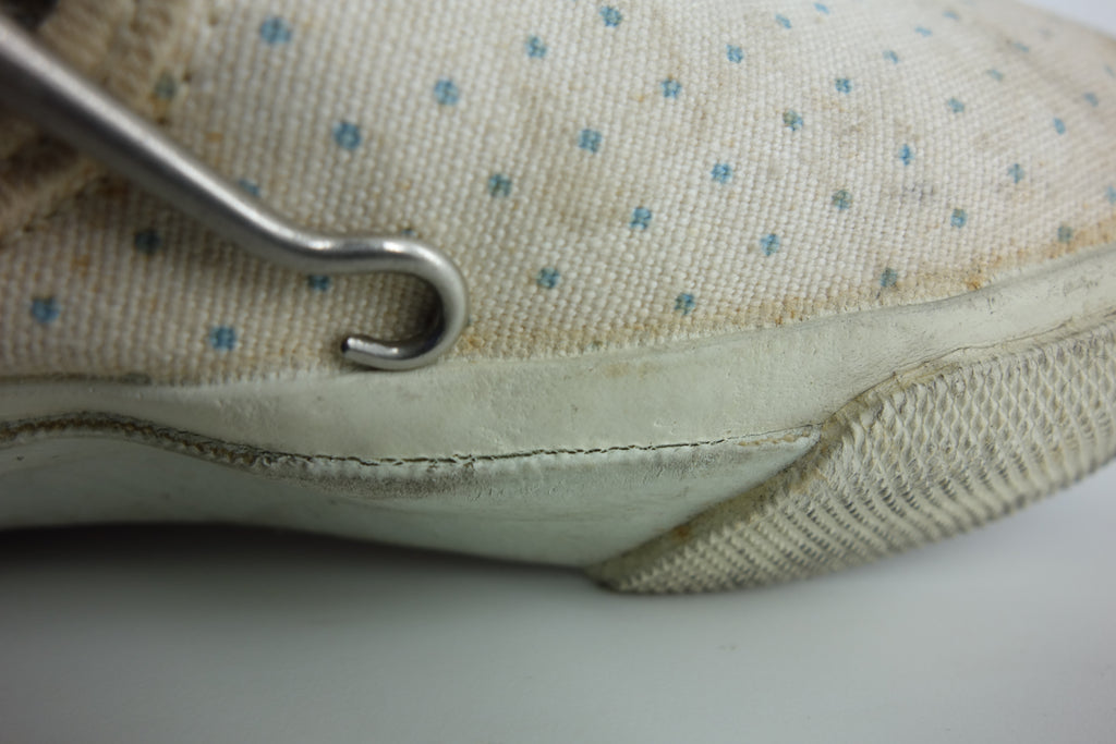 good used condition. all rubber remains soft & flexible despite some stress cracking from crush injury. some age spotting to canvas & discolouration under the internal toe cap.