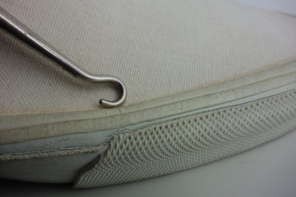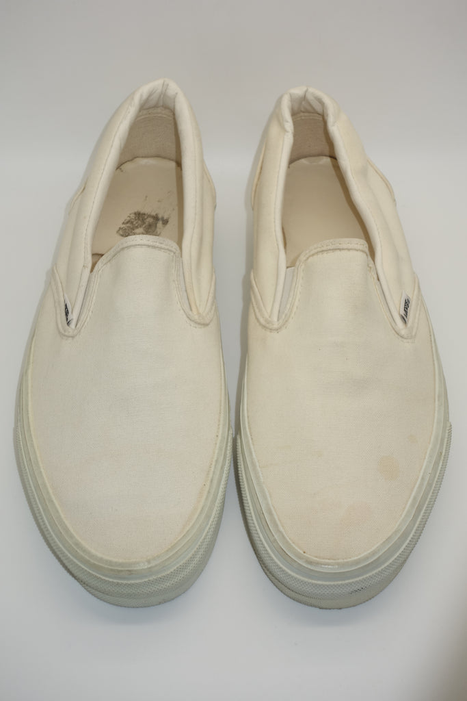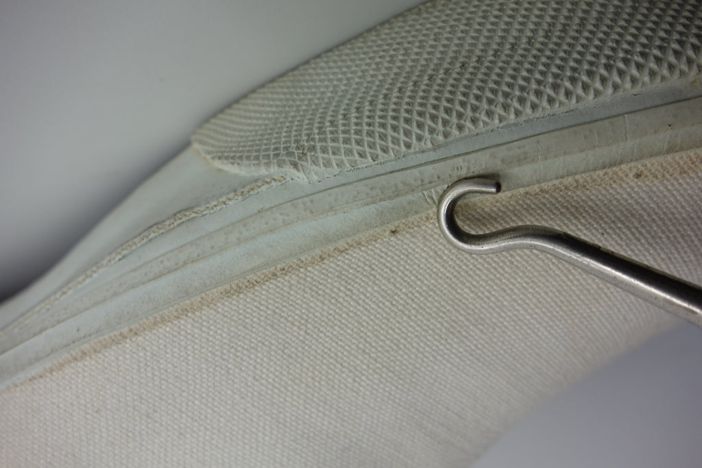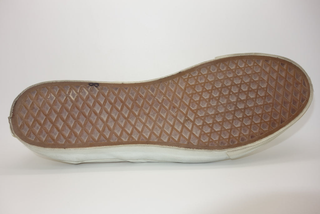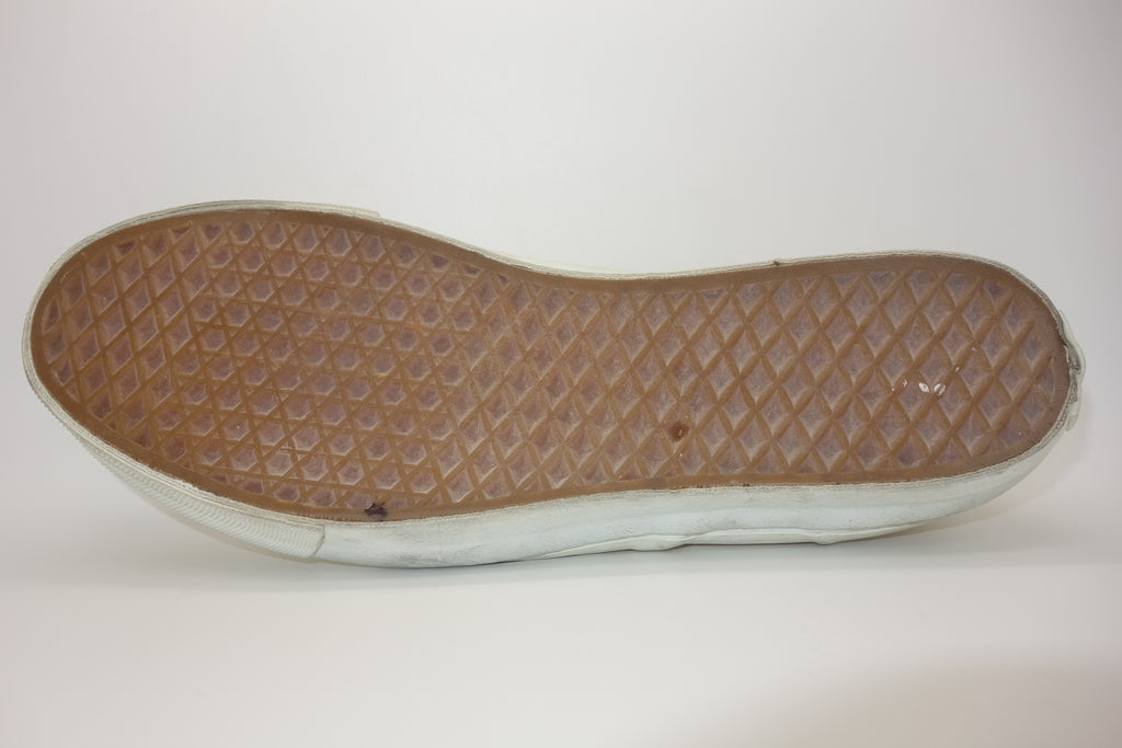superb used condition. worn a few times only. the right shoe saw very short term exposure to elements as display model with resulting rubber dryness & minor micro stress cracking of first foxing, however rubber remains soft & flexible. light dusting & storage wear only. 1 sticky area on vinyl insert will wash off.