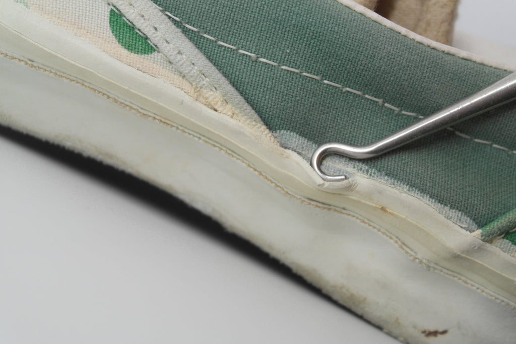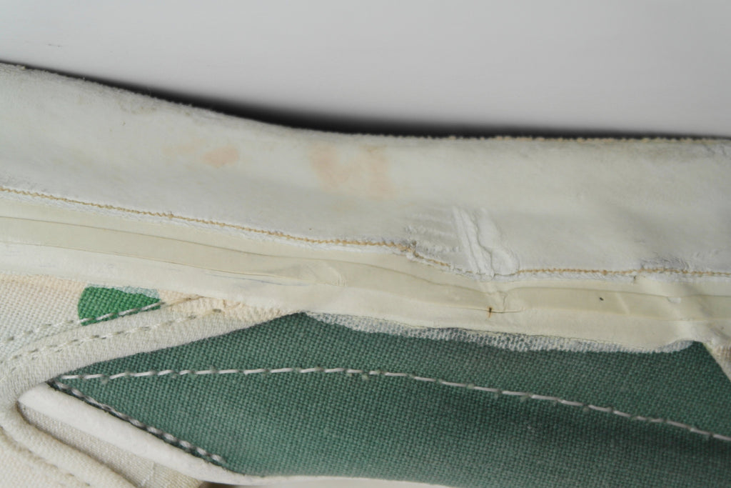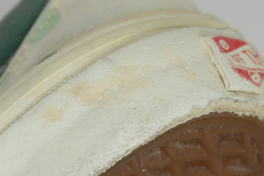 very good used condition. despite the odd impression mark to the midsole the white rubber remains soft & flexible. saying that the midsole has dried & shows significant wrinkling upon bend. from experience this will hold up to normal wear. the original vinyl heel pads were removed & replacement vinyl put in place, which i removed. the top layer footbed however is now tacky at the heel & coming loose from the foam in parts. this will not effect wear.
