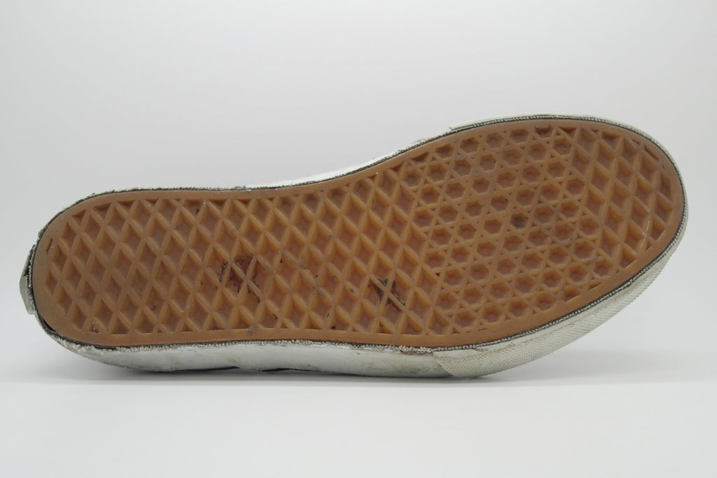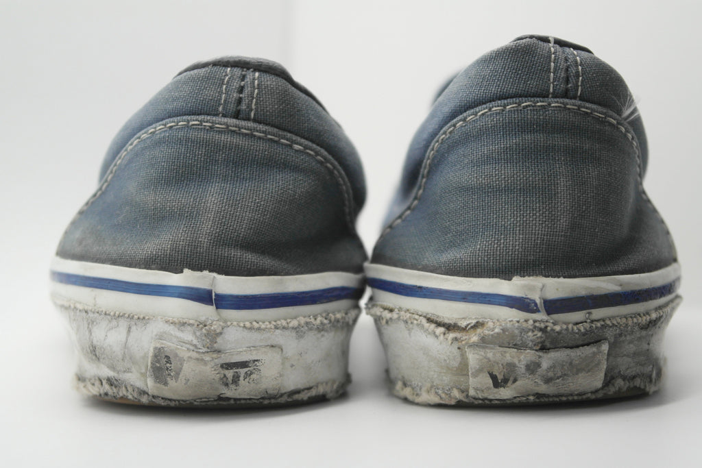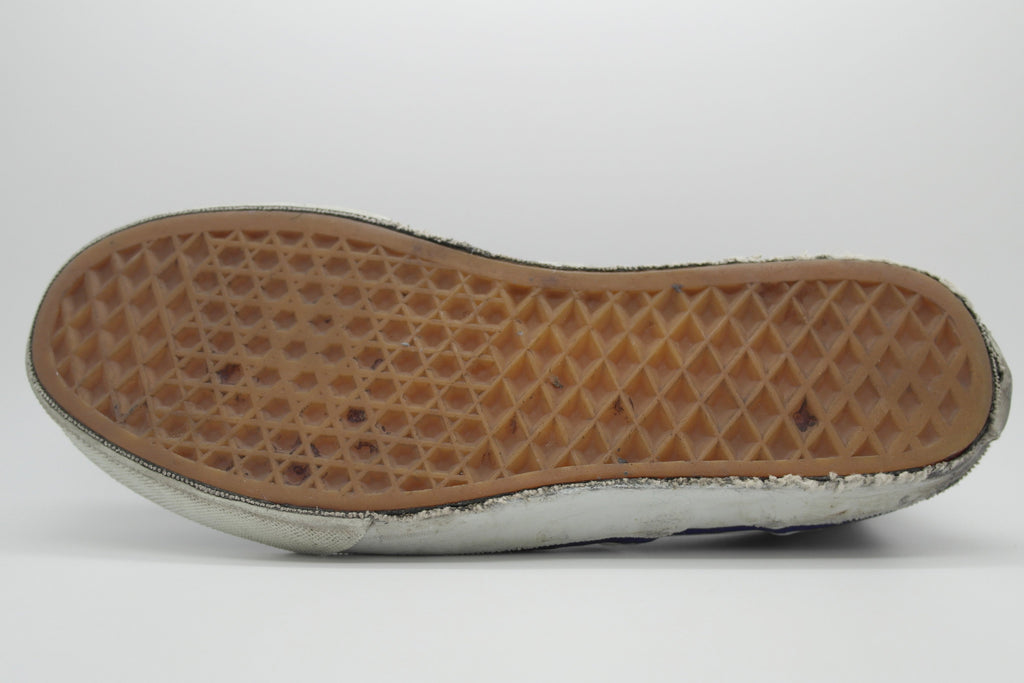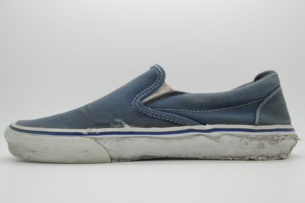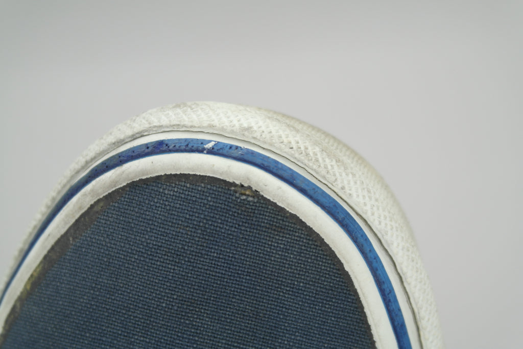 very good used condition. rubber remains soft & flexible with only minor micro-stress-cracking from crush injury. some wear to heel from removing shoes with feet. heel counter shows crush effect but internal counter still intact. the top canvas layer of the insole is loose at the toes.