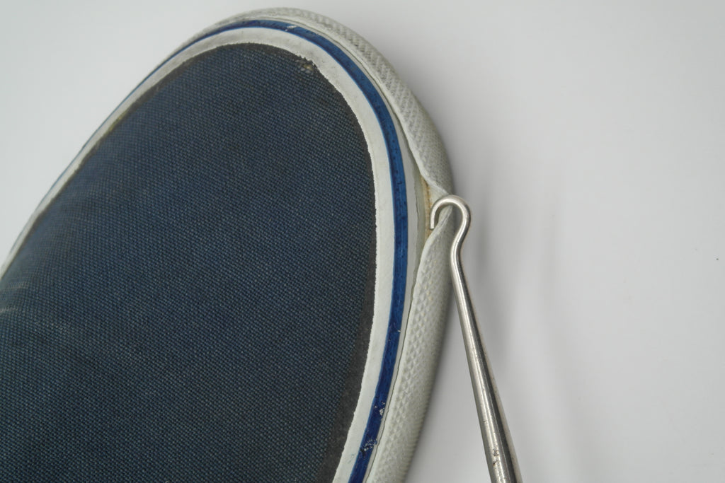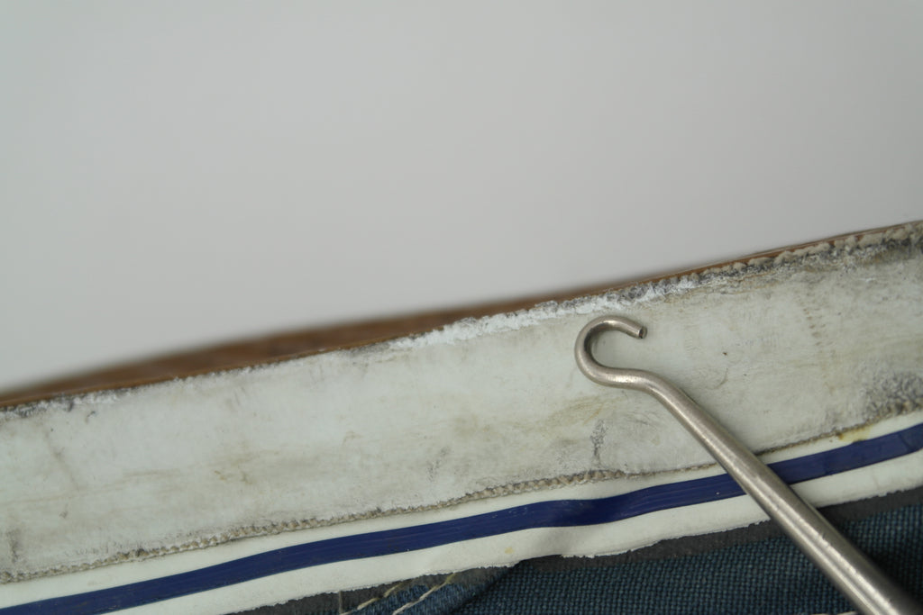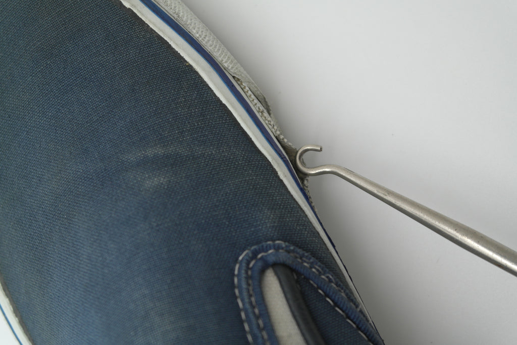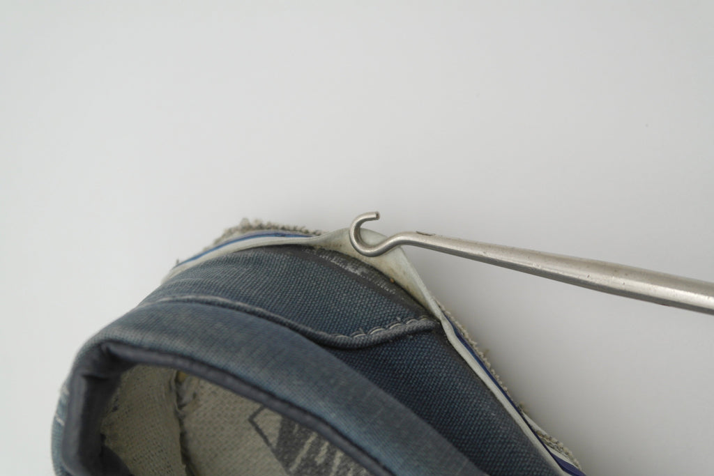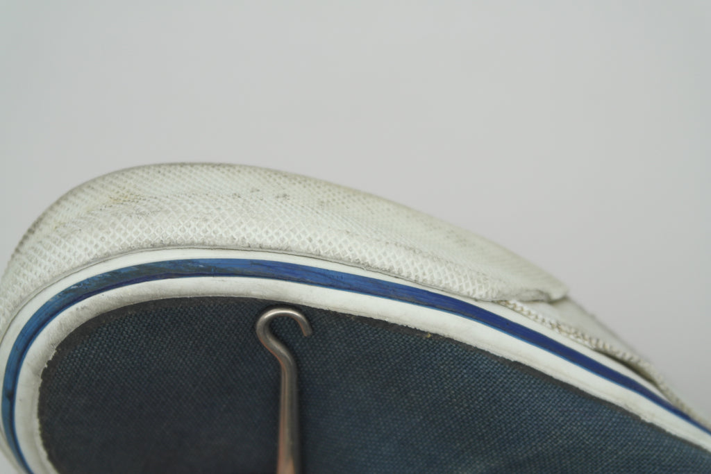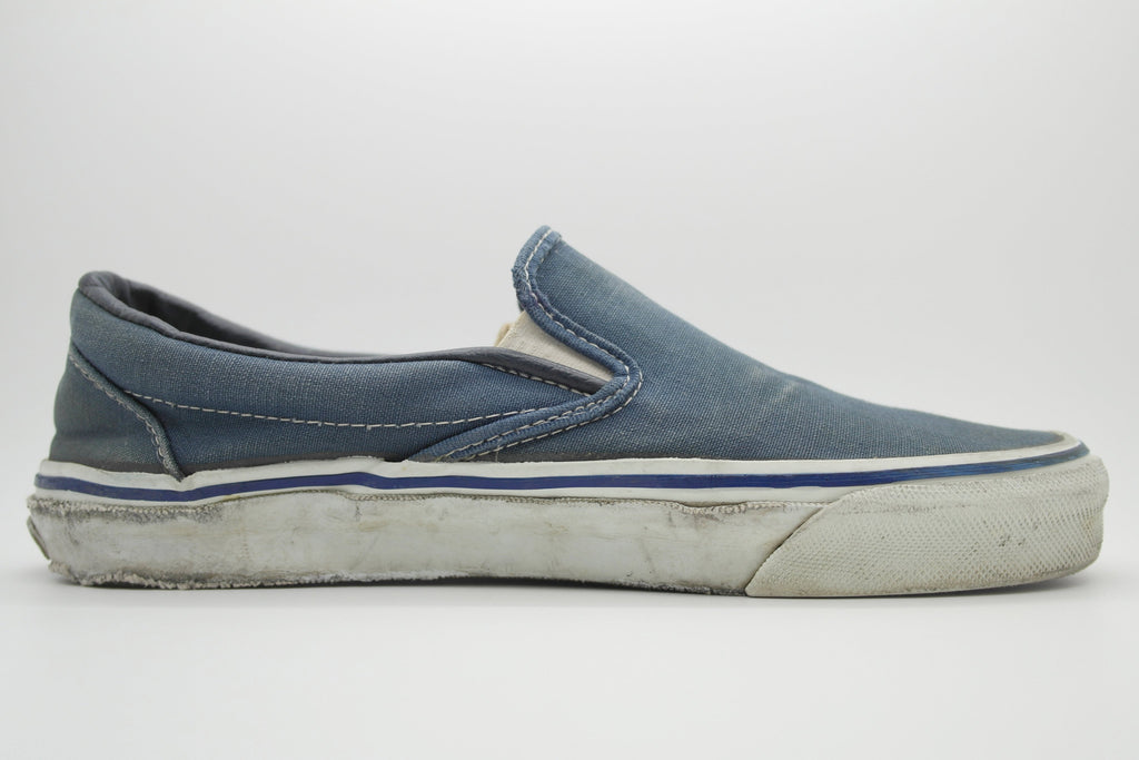 very good used condition. rubber remains soft & flexible with only minor micro-stress-cracking from crush injury. some wear to heel from removing shoes with feet. heel counter shows crush effect but internal counter still intact. the top canvas layer of the insole is loose at the toes.