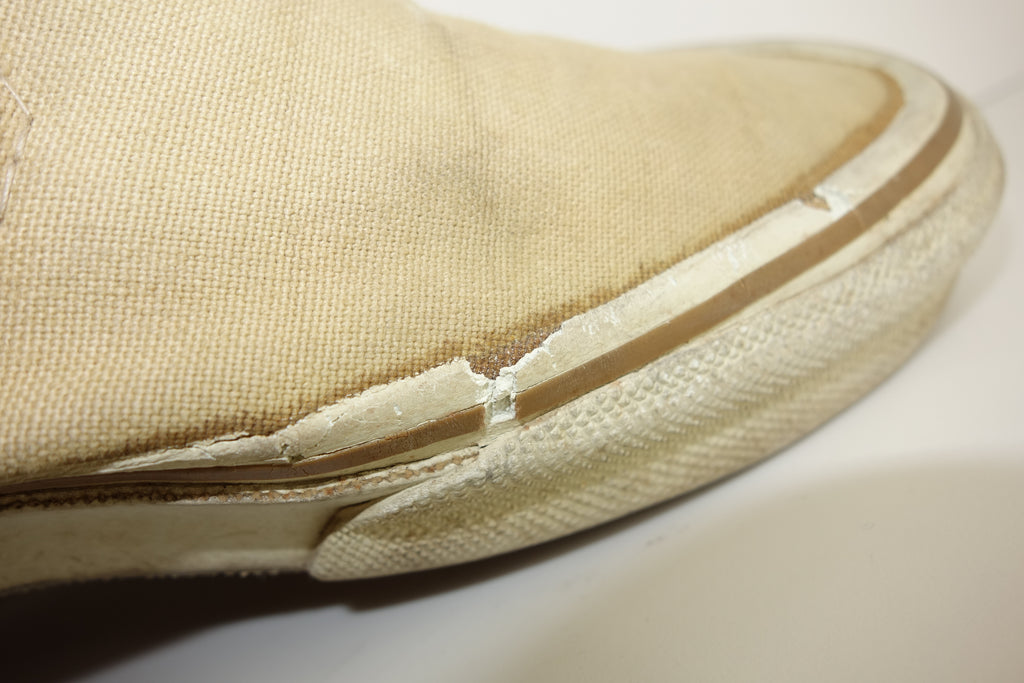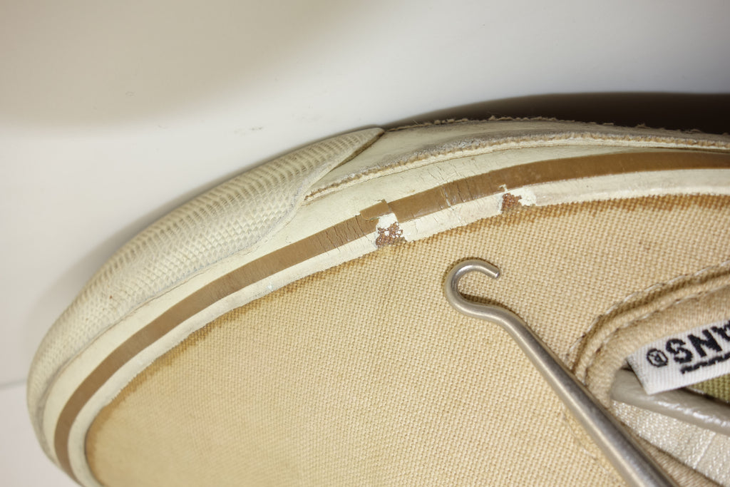 good used condition however the first foxing (stripe) area has solidified & become brittle. cracking will continue & significant loss of rubber will ensue. the friction itself & bumper & waffle are unaffected. they will hold up to normal wear however with significant loss of rubber. no size visible however confident of US8 if not US7.5. wear at own risk!