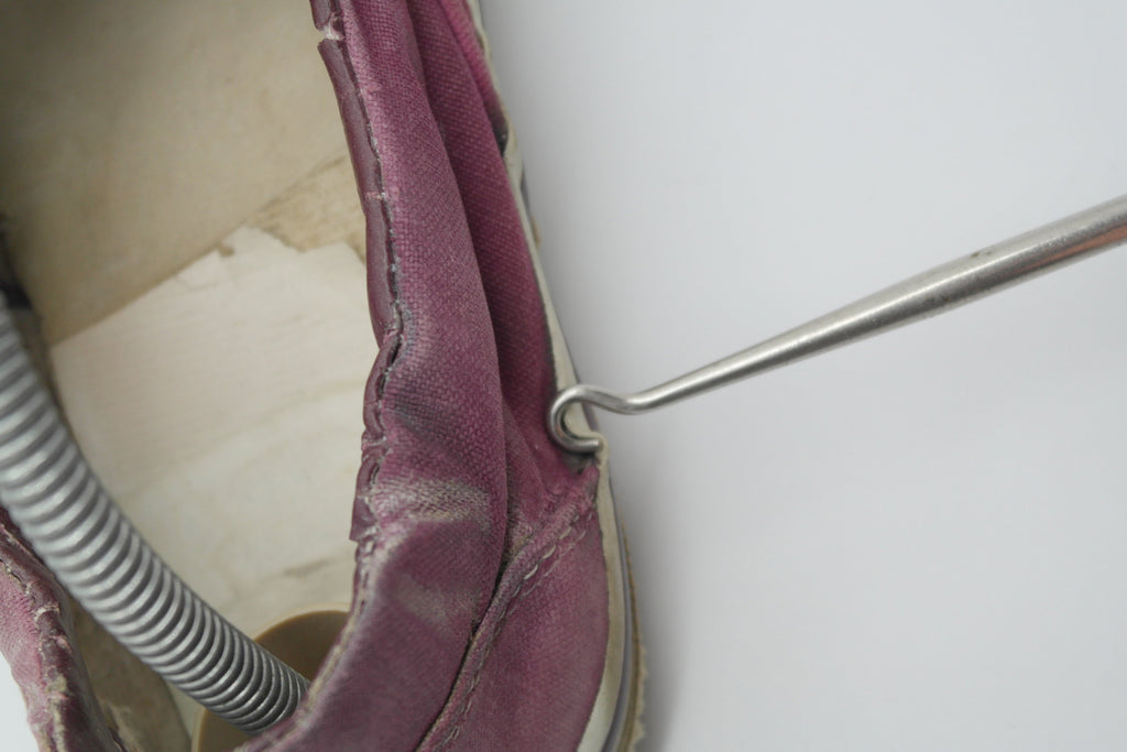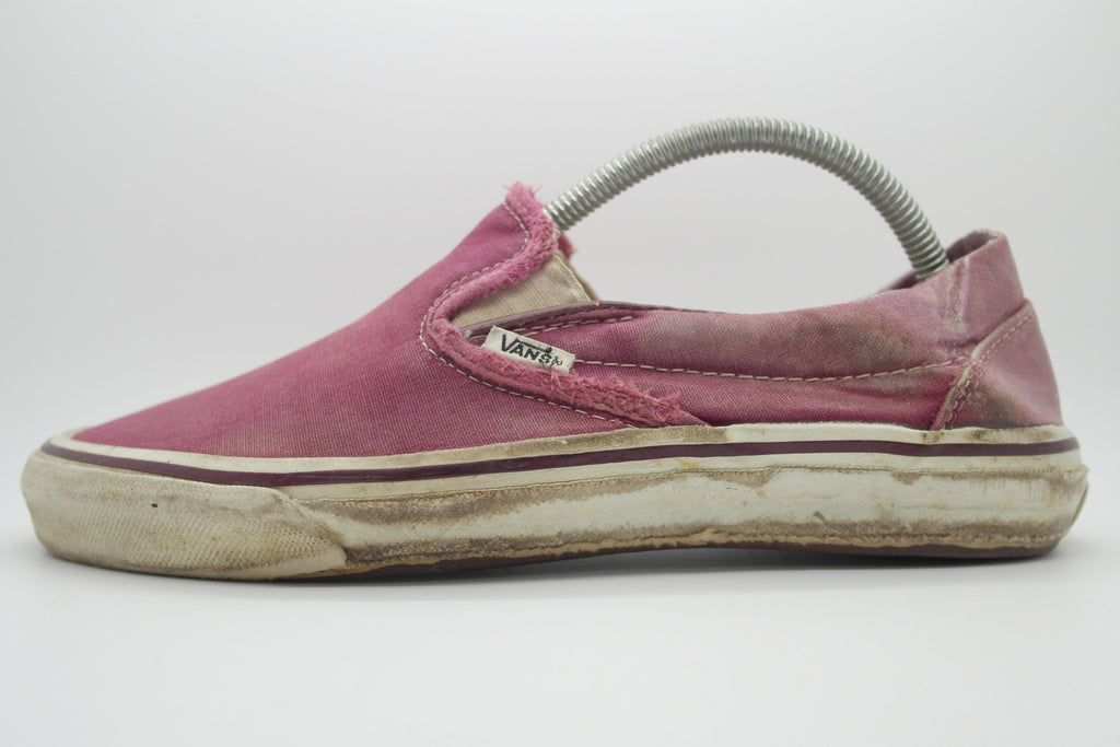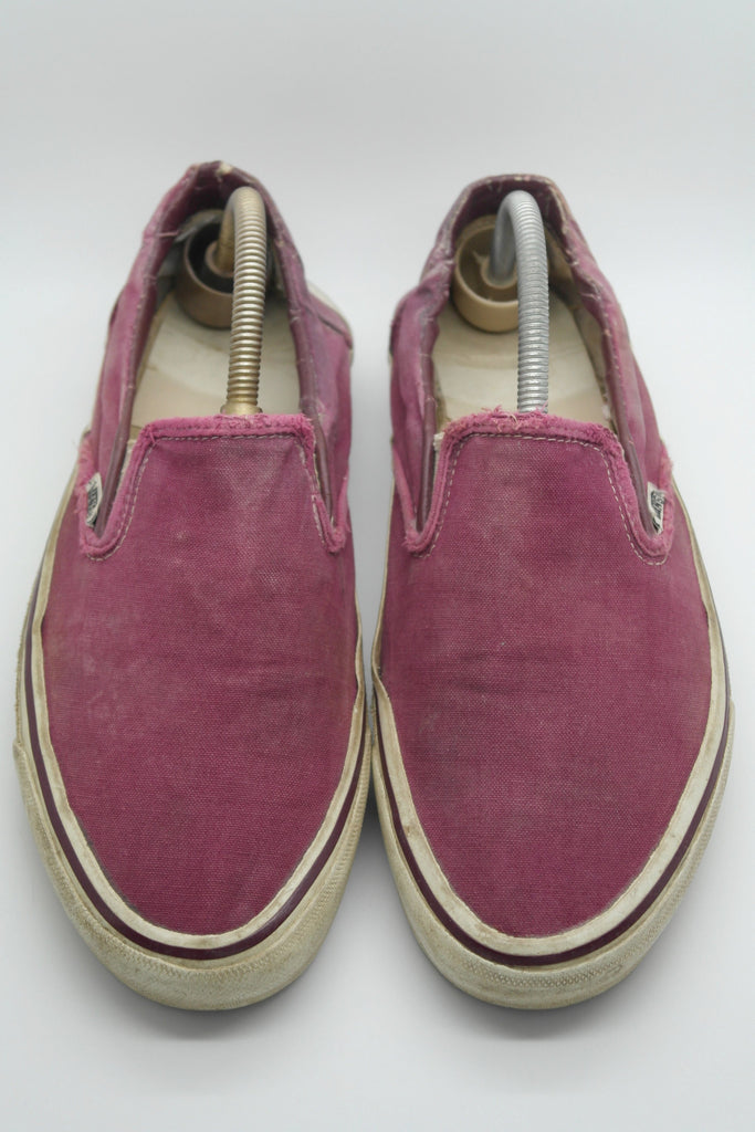 good used condition. these were worn as slippers at the expense of flattening the heel however the internal heel counter remains relatively intact despite the bend. 1 split to the counter at lower right insole level should not effect wear. some splitting & 1 small tear to vinyl collar. minimal separation between rubber & uppers at toe creases. minor micro-stress-cracking under foxing stripe. significant wear to insole at both big toes & to lining at pinky toes, may require replacement insole. otherwise well taken car of & rubber remains soft & flexible.