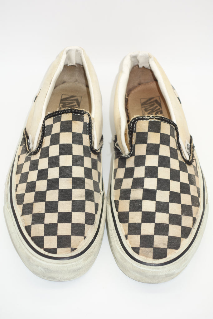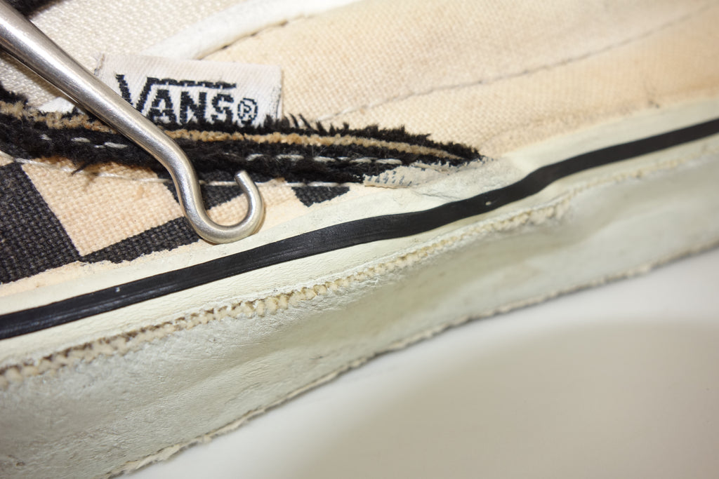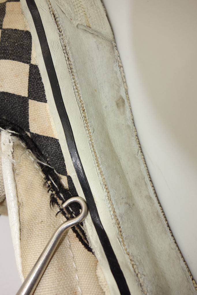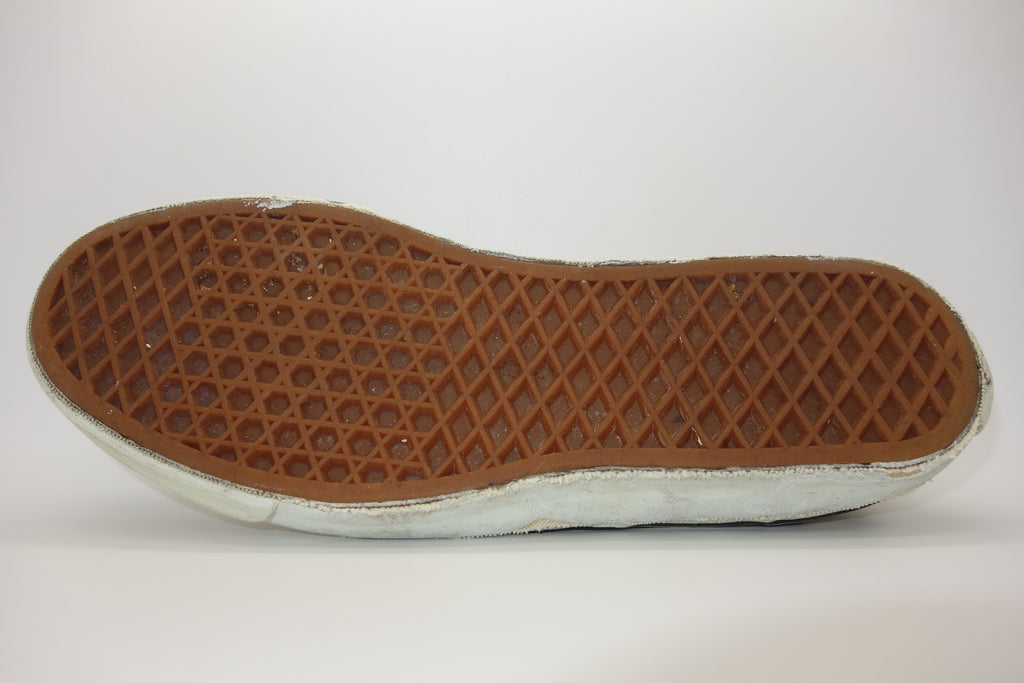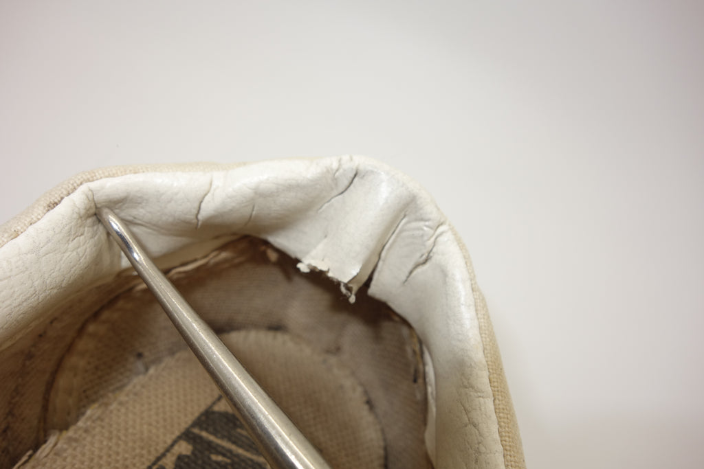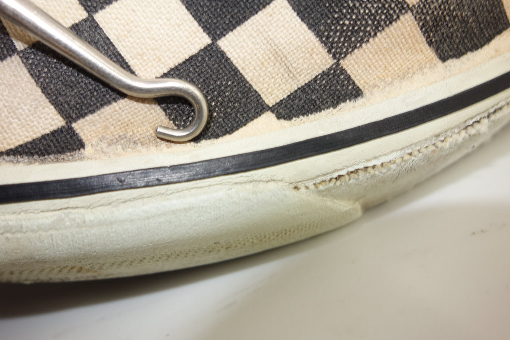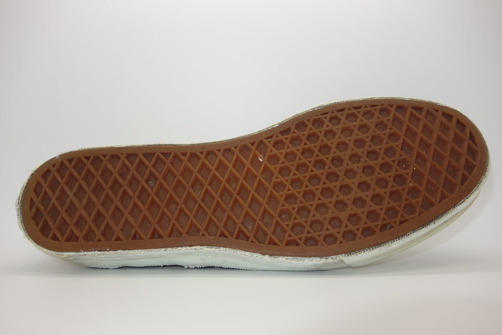 good used condition. all rubber remains soft & flexible, albeit dry, despite separaation from uppers at toe creases & minor stres cracking to first foxing. both medial elastic gussets have been unstitched at the medial side allowing greater forefoot width. the job was not executed so well however normal wear is maintained & could be repaired. both vinyl collars show splitting at base of collar.