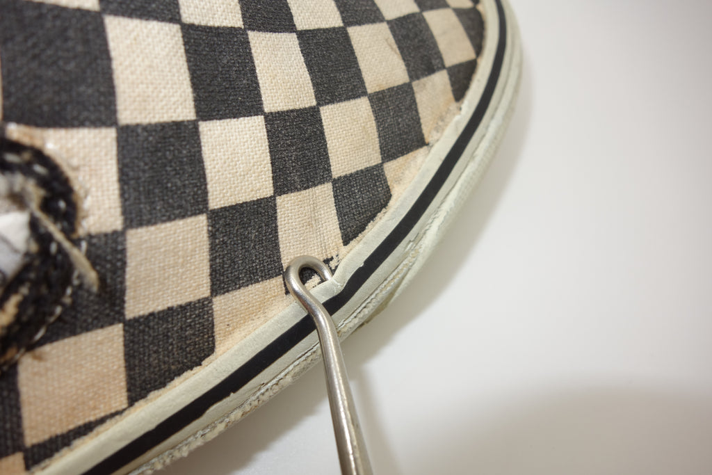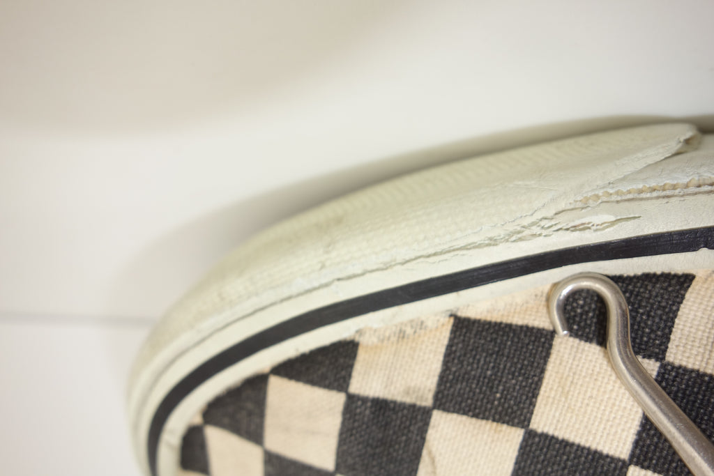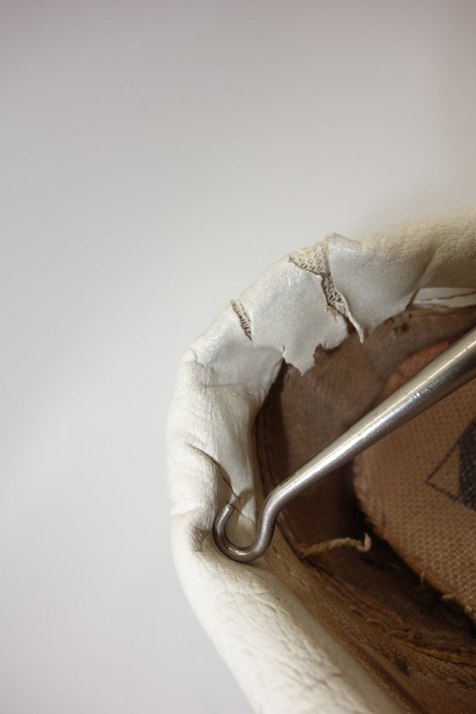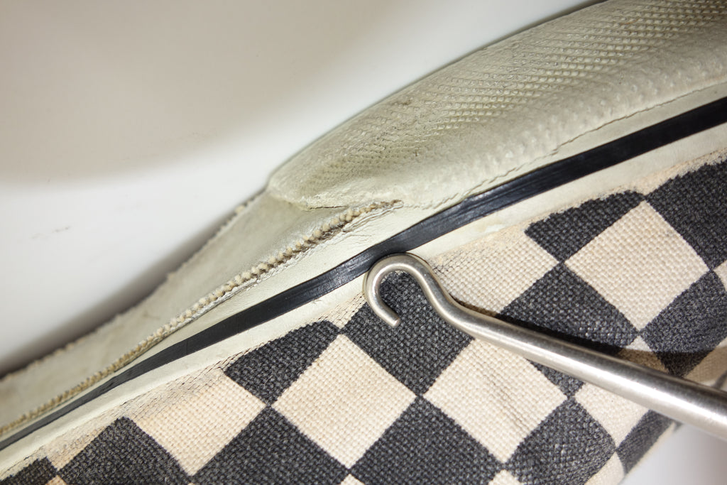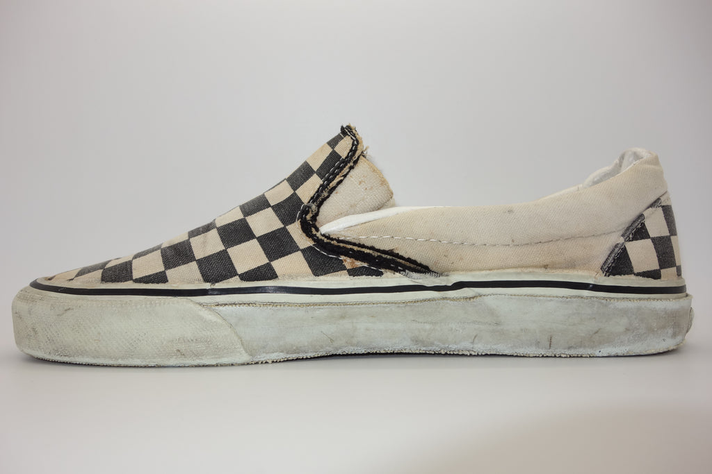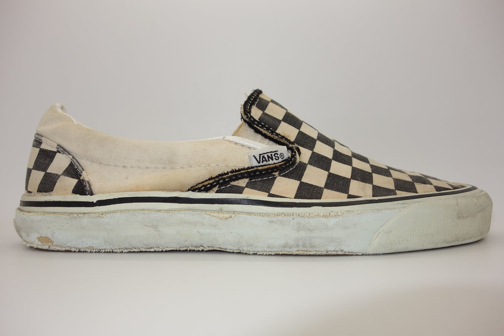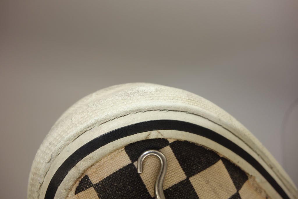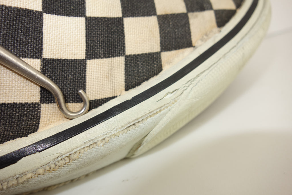 good used condition. all rubber remains soft & flexible, albeit dry, despite separaation from uppers at toe creases & minor stres cracking to first foxing. both medial elastic gussets have been unstitched at the medial side allowing greater forefoot width. the job was not executed so well however normal wear is maintained & could be repaired. both vinyl collars show splitting at base of collar.