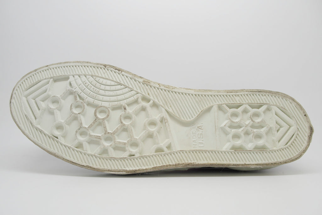 unworn with storage wear only. the left mid sole is unaffected however the first foxing does reveal hardening to the heel only which may lead to separation between uppers & rubber & possible flaking in that area. the right mid sole shows some wet rot with impression marks & tackiness however there is no hardening. the heel of the right shoe also shows solidification to the first foxing & hardening to the foxing stripe almost throughout. micro-cracking is already visible however only the foxing stripe of harder rubber should flake away. from experience these will hold up to normal wear with some loss of foxing stripe only & possibly separation of rubber & uppers at the heel. wear at own risk! these fit slim & suit best women or men with narrow feet