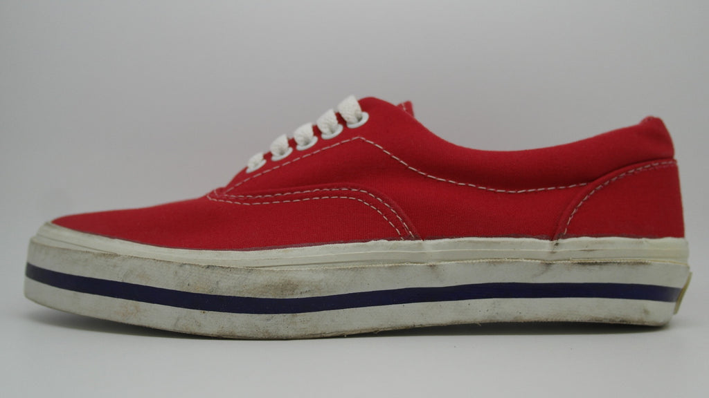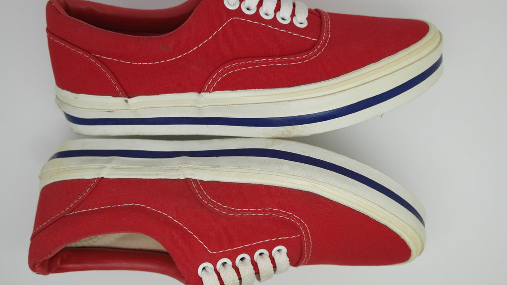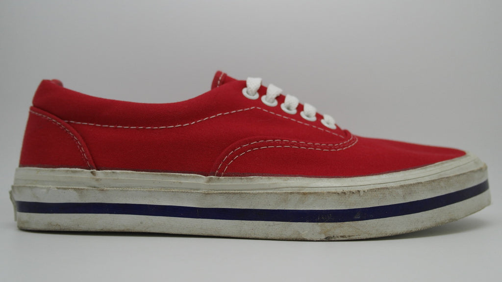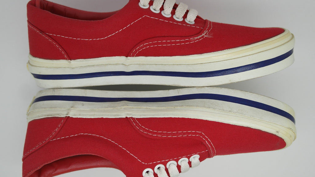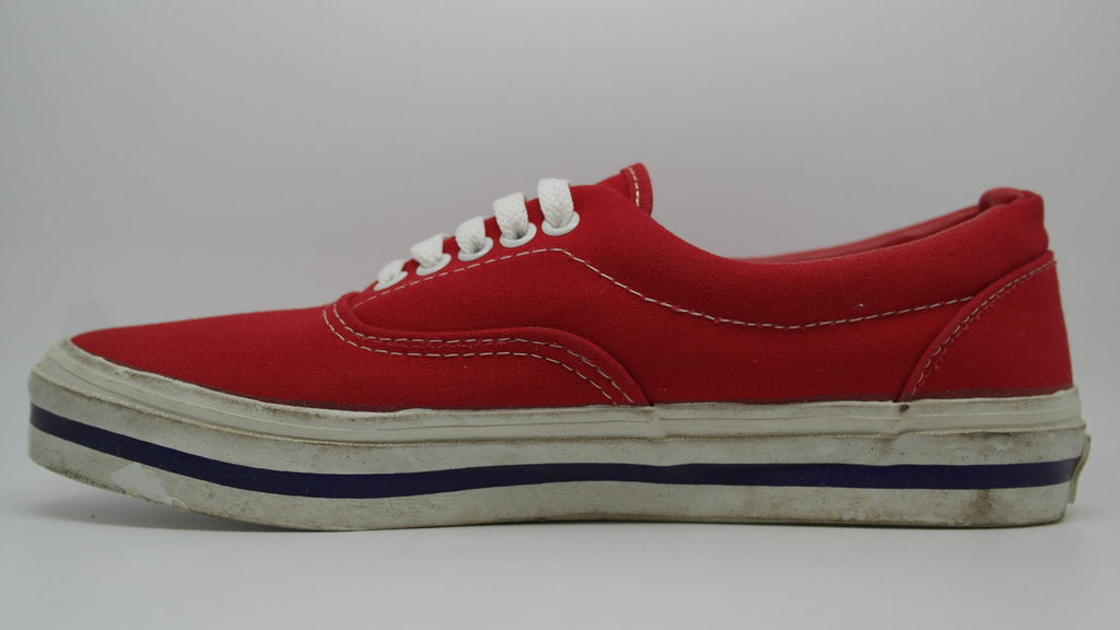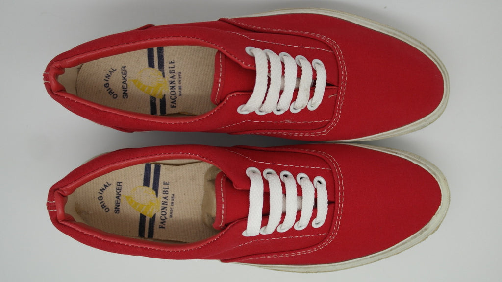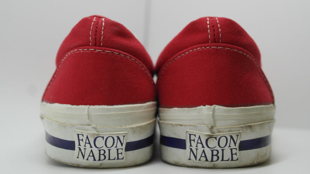faconnable branding but unmistakeably vans. mk2 vulcanised style #95 with white basketball e sole, logo footbed & all the markings of og vans. the majority show remnants of the vans label on the vamp, removed as a factory error.