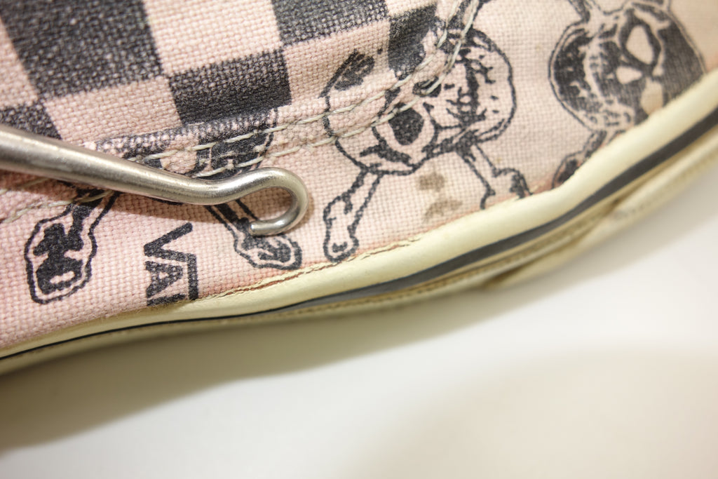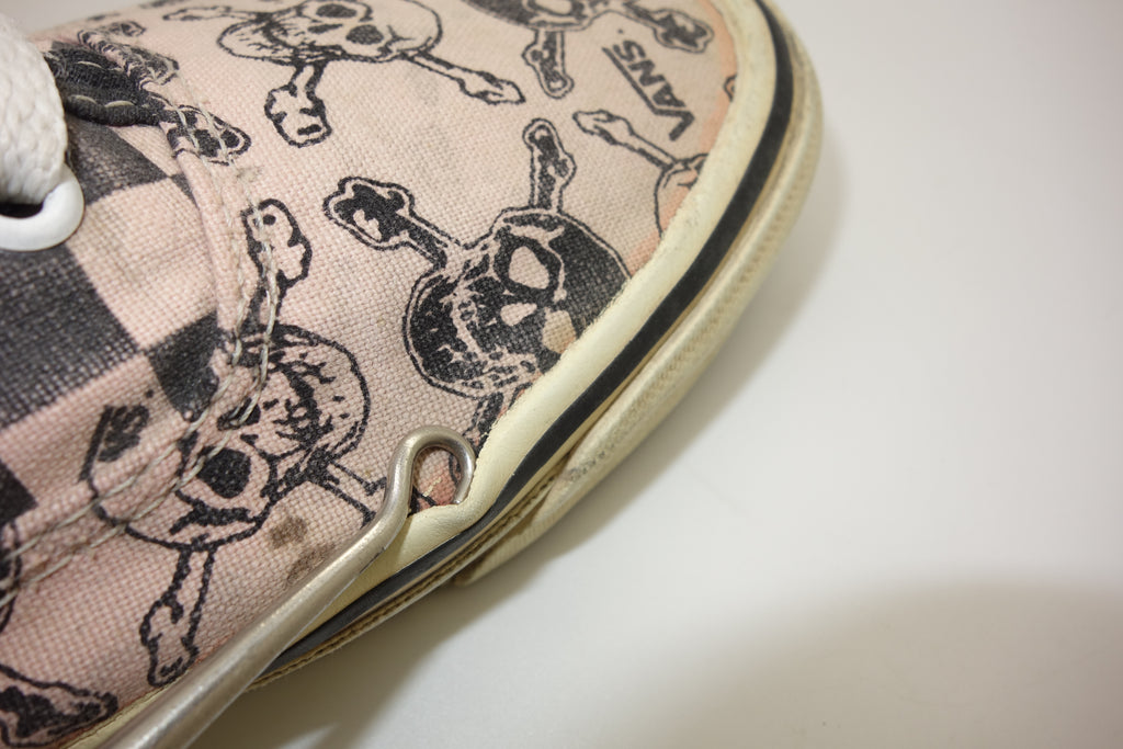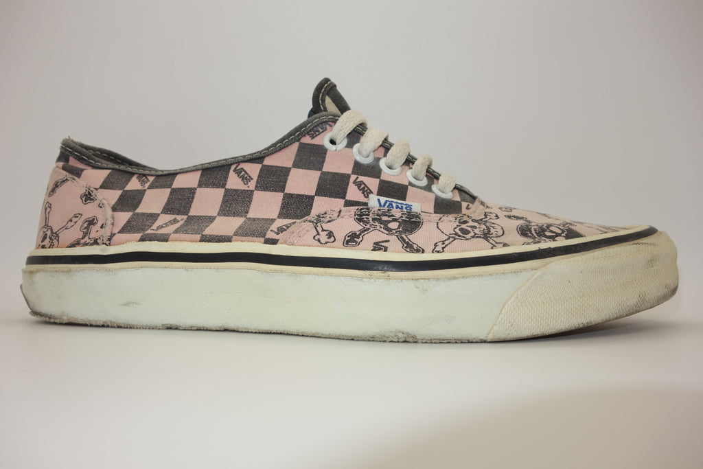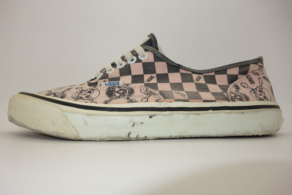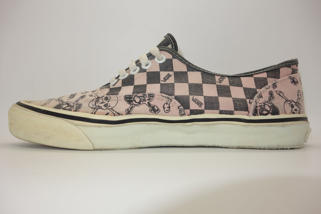 black on pink punkskull, checkerboard canvas, black/white primary stripe tongue.
