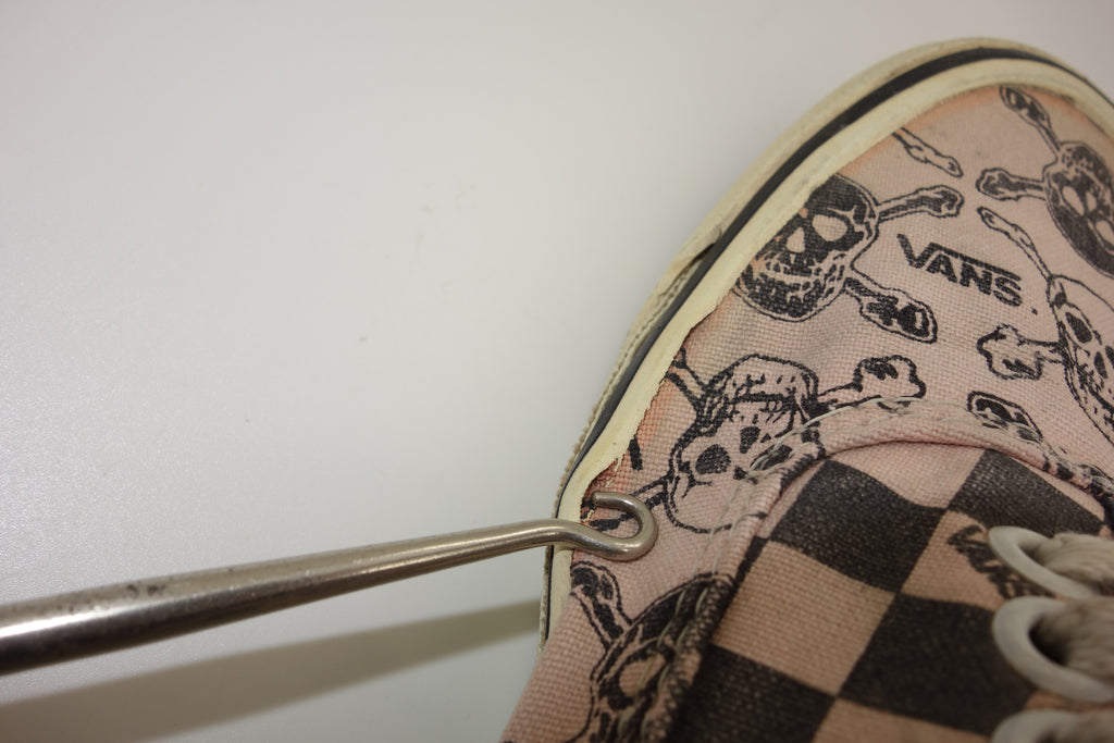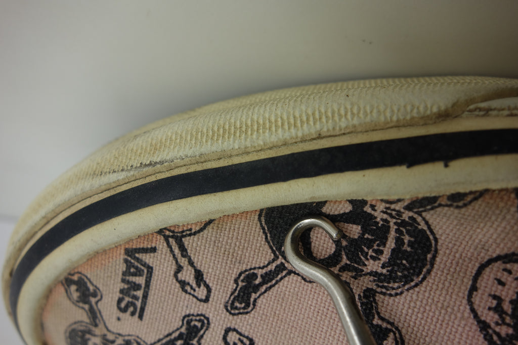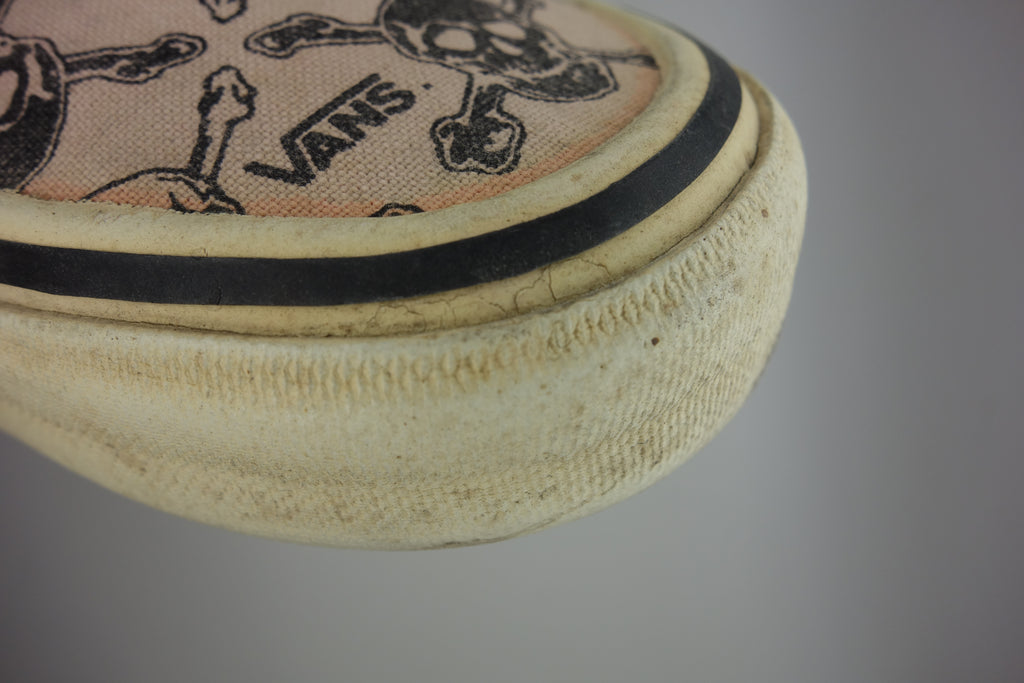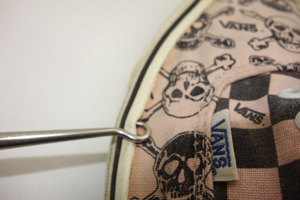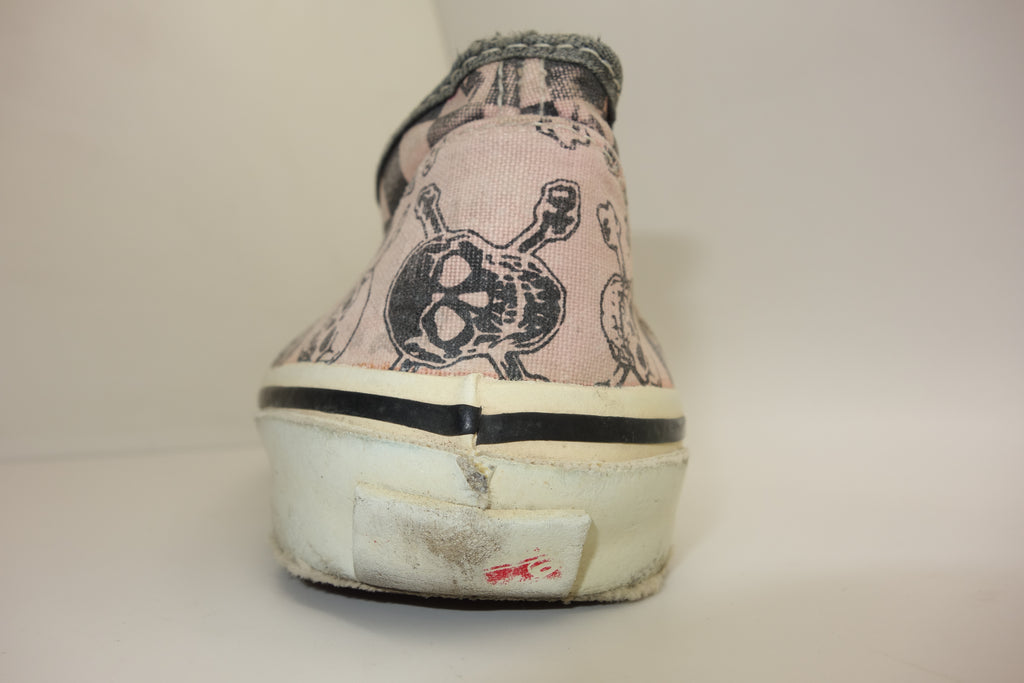 black on pink punkskull, checkerboard canvas, black/white primary stripe tongue.