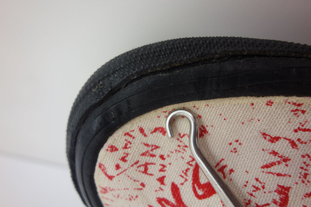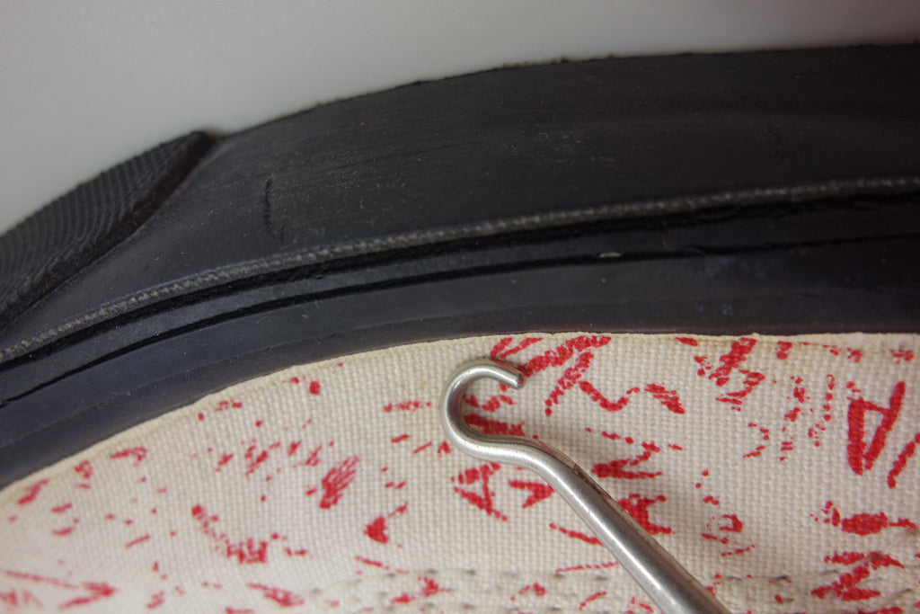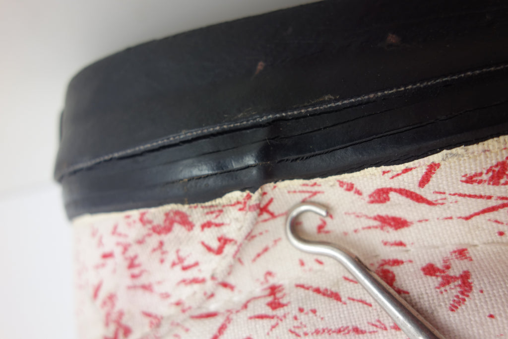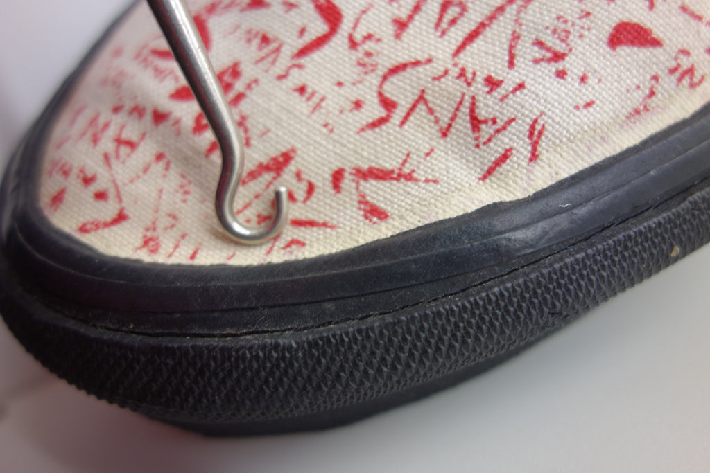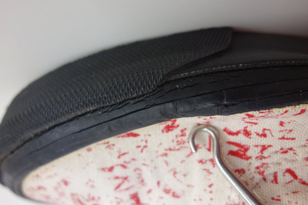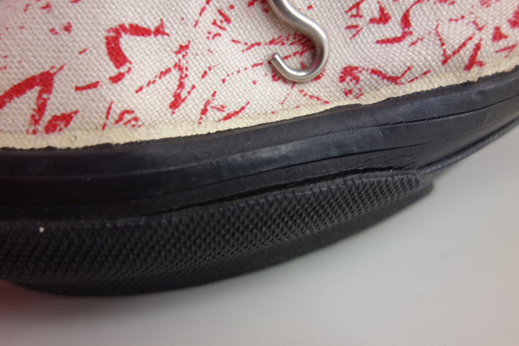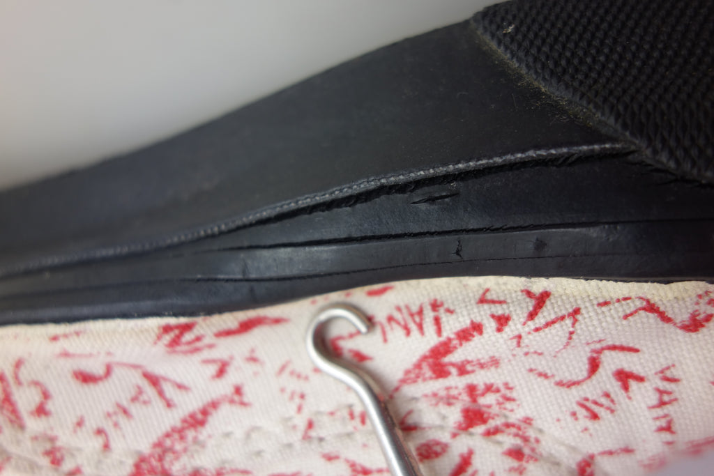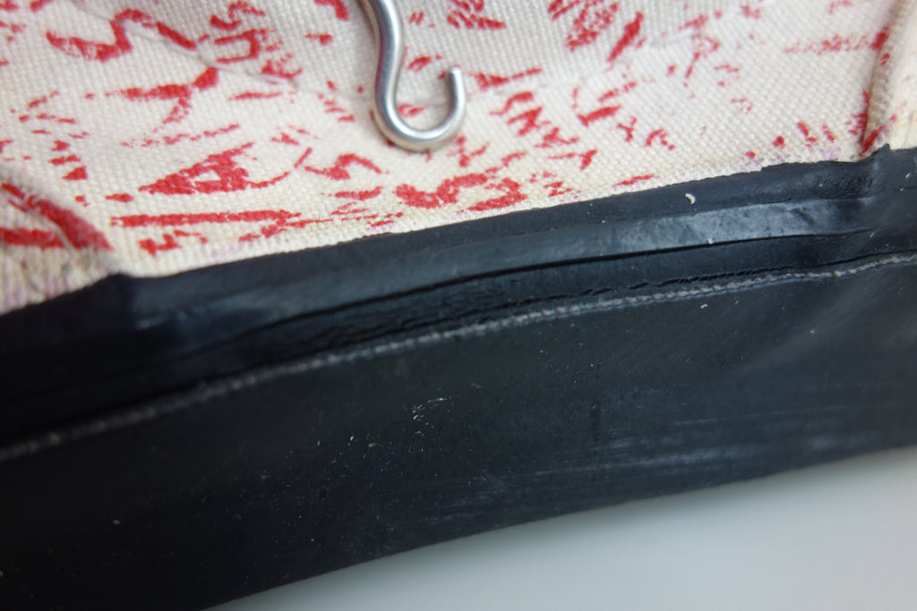 excellent used condition. all rubber remains super soft & flexible. they show widespread and deep stress cracking from crush injury during storage. the right internal toe cap has stiffened which doesnt effect the rubber however does miss-shape the canvas. they show minimal age spotting to canvas & discolouartion from water damage.