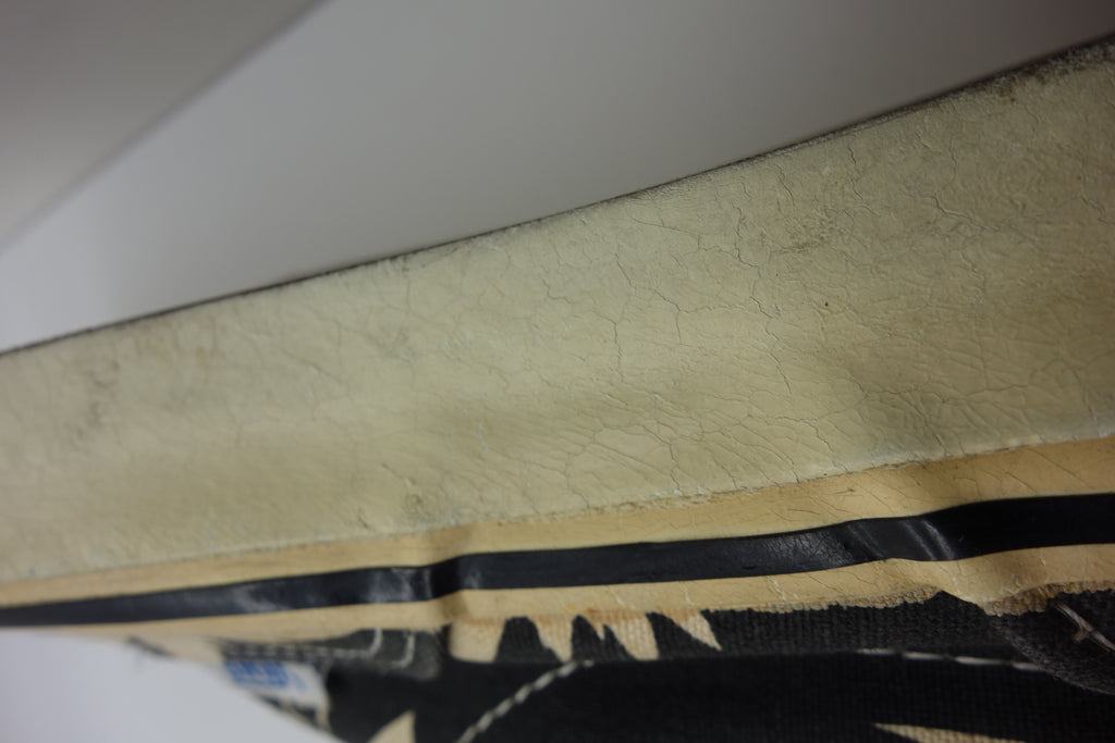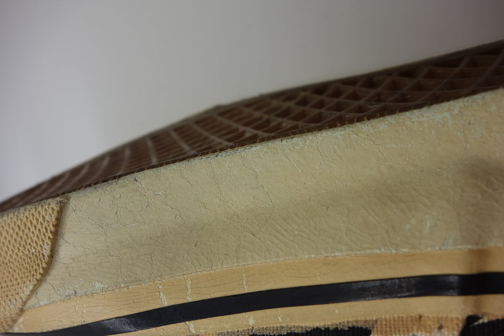 excellent used condition. barely worn however both shoes saw significant exposure to the elements with resulting rubber yellowing. despite this all rubber remains soft & flexi. widespread surface jigsaw cracking shows on the friction however from experience shoes of this age hold up to normal wear & the top layer of rubber will continue only to slough away, rather than crack. size no longer visible. no original laces. wear at own risk!