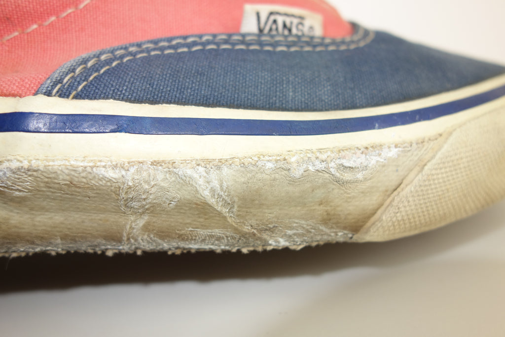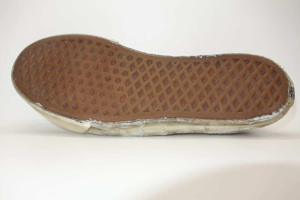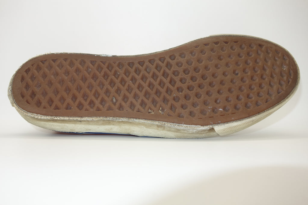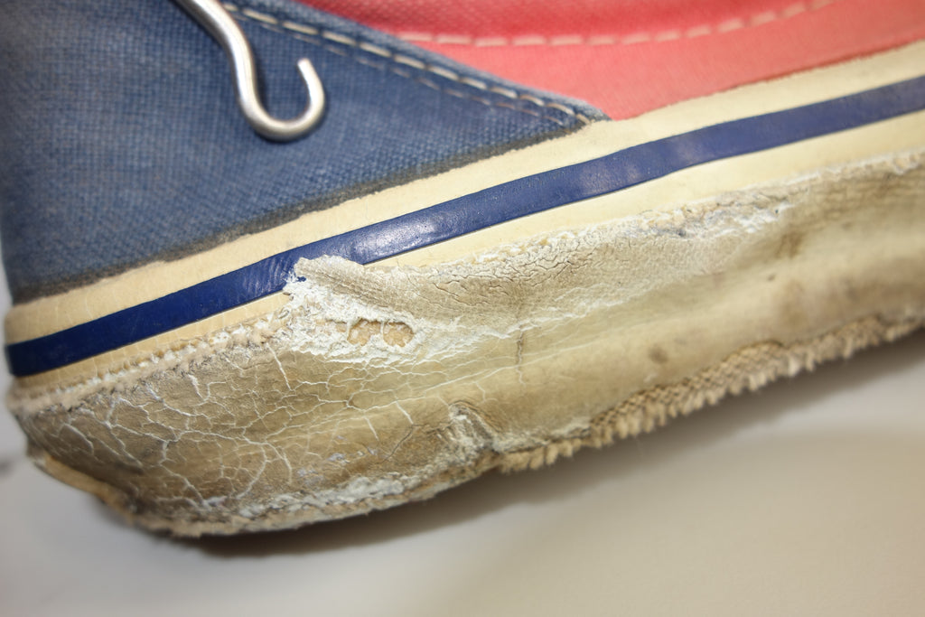 very good used condition. all rubber remains super soft & flexible. some evidence of minor wet rot to the friction & rubber sloughing however any tackiness has dried & this area will not effect wear/longevity. 1 significant misshapen dent on the medial right from crush injury during storage however remains soft & will mould back into shape with wear. laces not original.